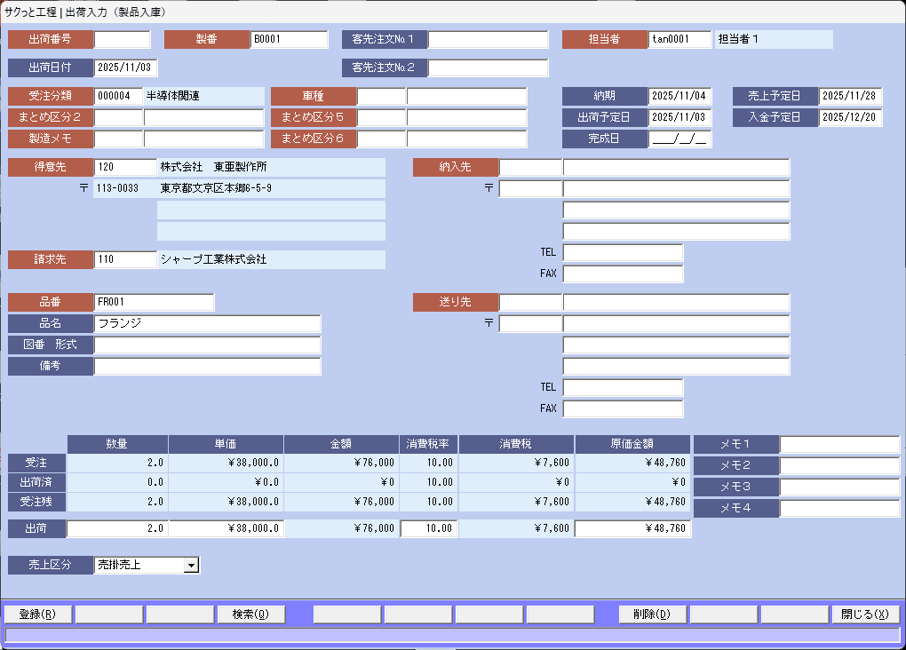 出荷した物件情報を入力します。分割での出荷の場合も出荷単位で原価を管理できます。